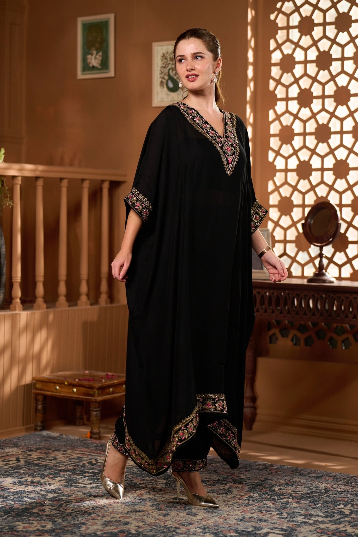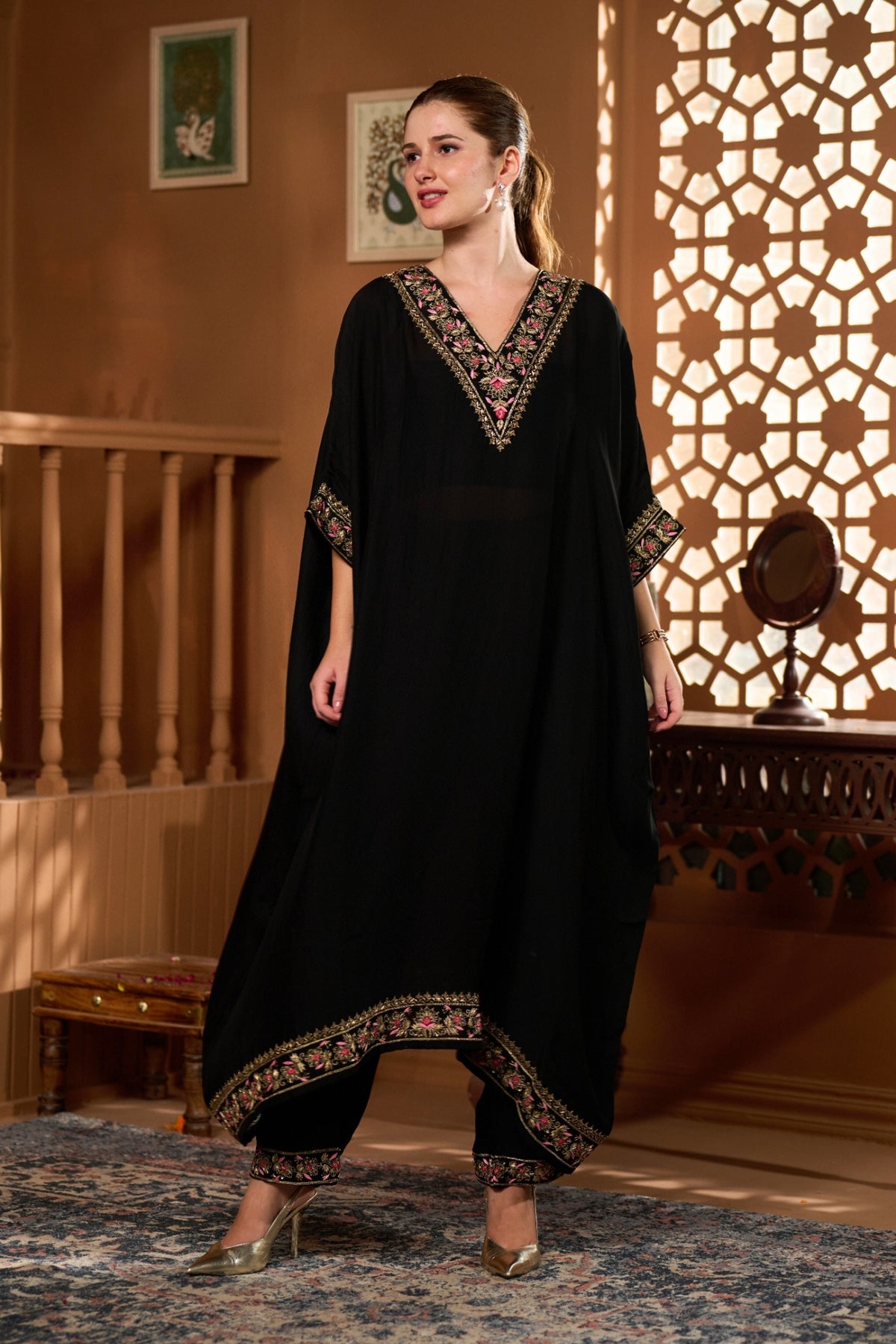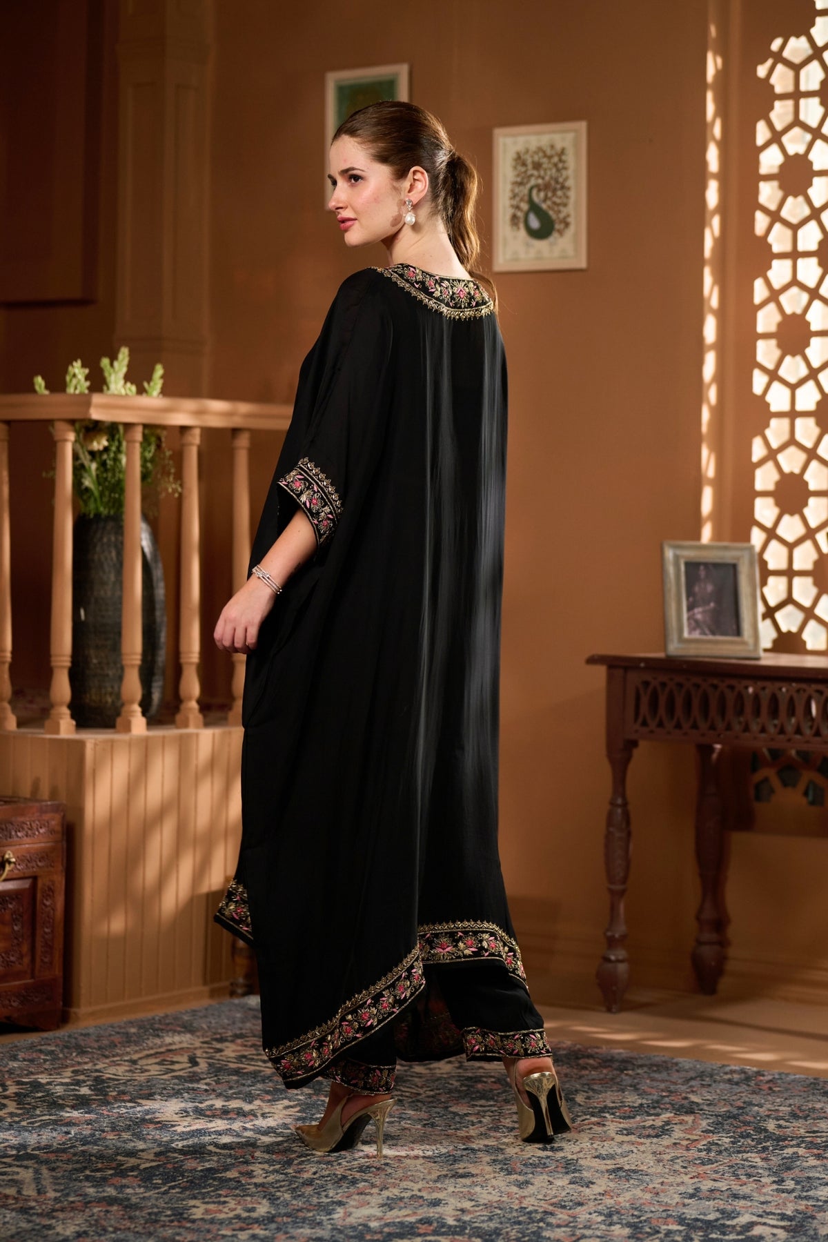 • The Taroob Hand Embellished Choga Set features luxurious handwork and regal design, making it a statement hand-embellished choga set for grand celebrations.